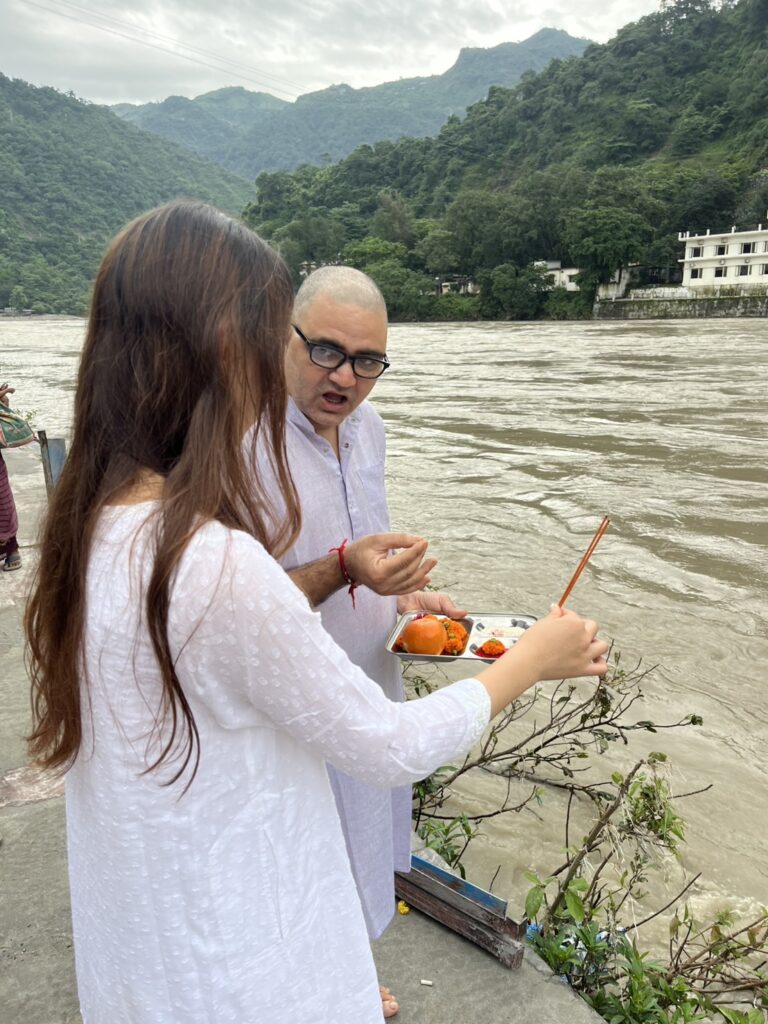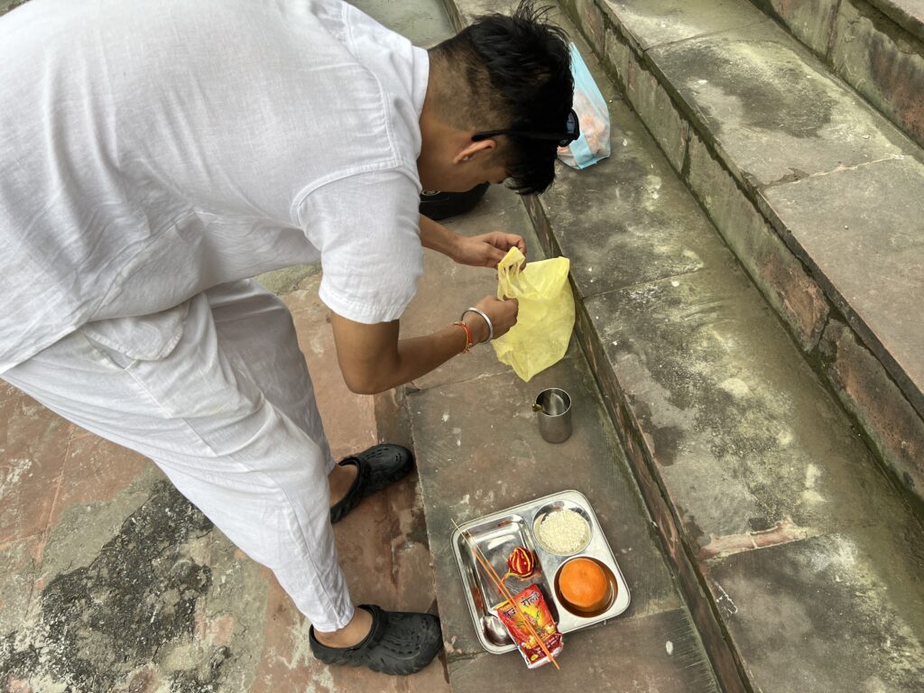 儀式では、司祭(グルジ)がガンジスの水をすくい、手を清めたり、飲むように促されたり…。