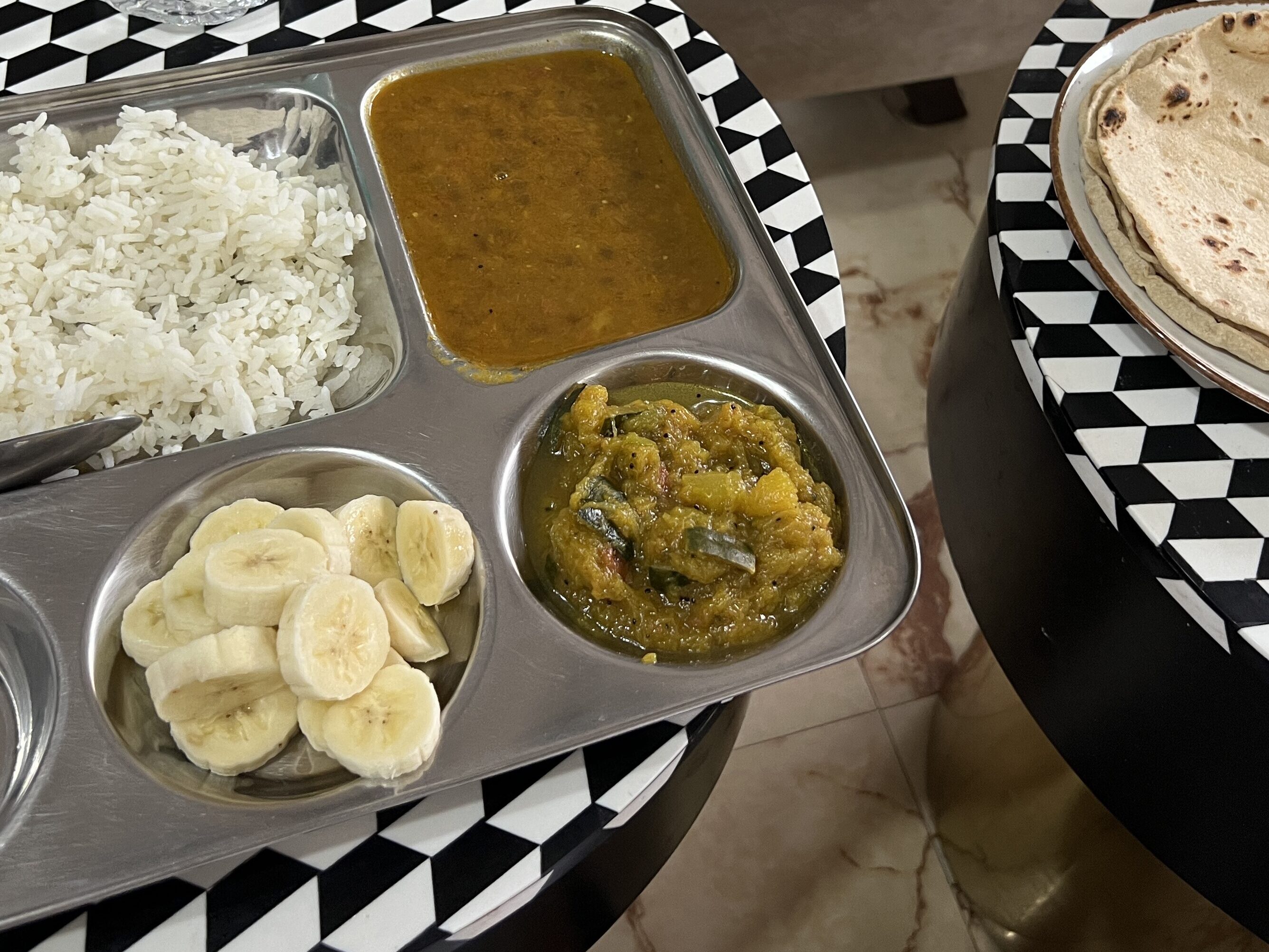 そして19:00から晩御飯。炭水化物が多いけどこのカレー味のお芋が美味しいし、ダルはサラッとしてて食べやすい。そのためおかわりしました!